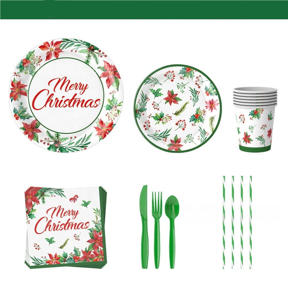 Christmas Disposable Tableware Set Paper Plates Cups Napkins Banners Tablecloth Cutlery for Merry Christmas Party Decor Supplies