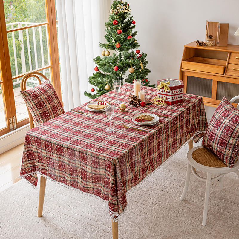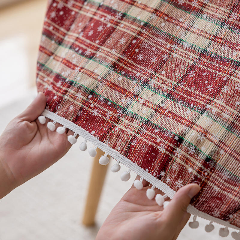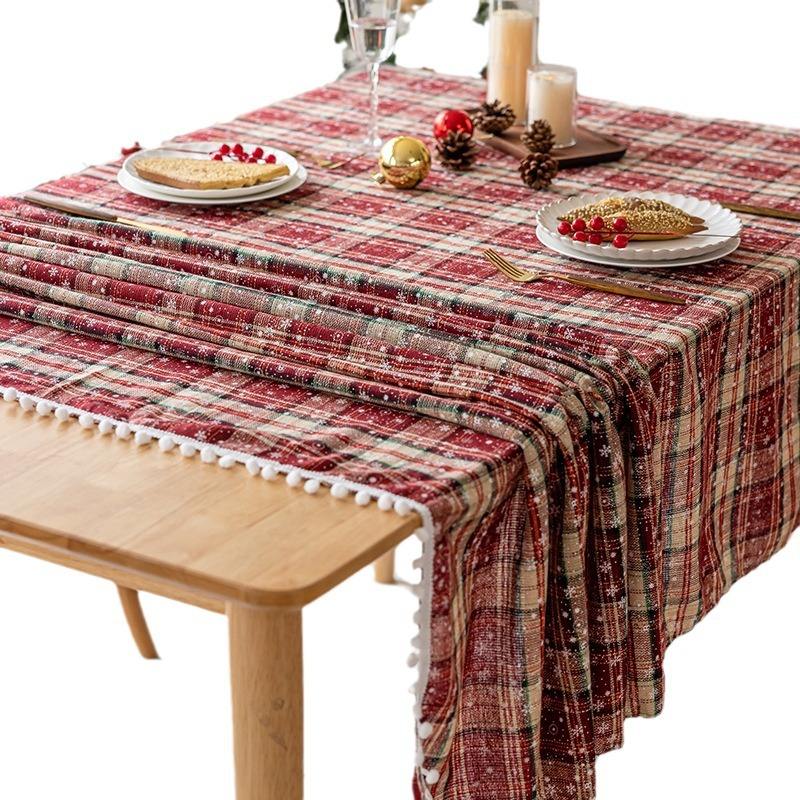 Christmas Embroidered Tablecloth Rectangle Red Snowflake Pattern Pom-pom Edges Polyester Home Use Waterproof Oil-resistant