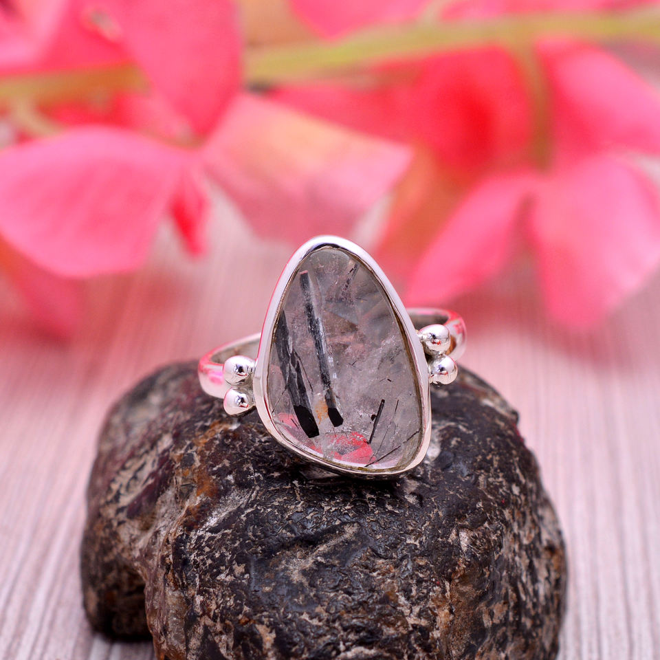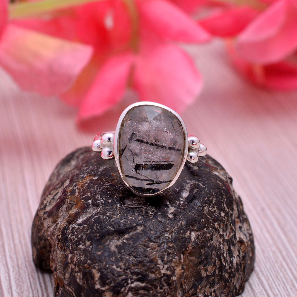 Christmas Gift Natural 925 Silver Black Rutile Quartz 18x12mm Uneven Oval Gemstone Ring 4.12 gm Sterling Silver Girl Finger Ring
