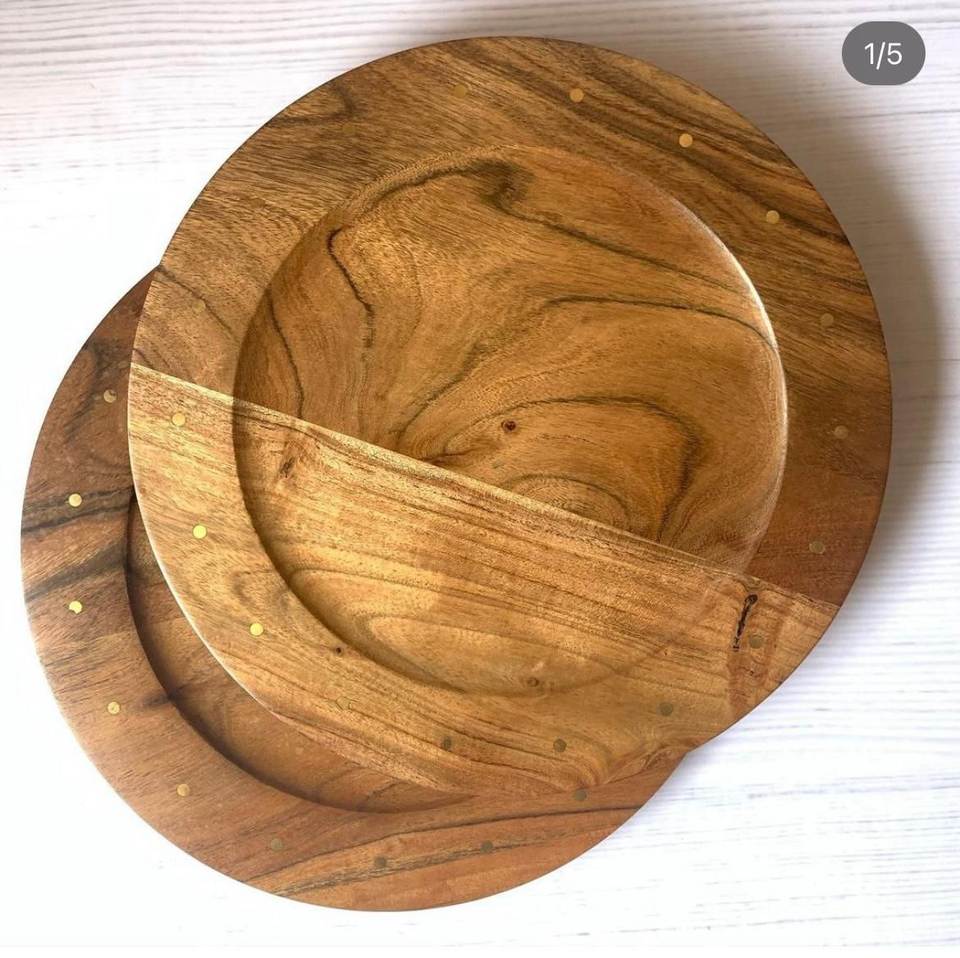 Christmas Gifts Natural Wooden Serving Plate Round Shape with Brass Gold Dot Inlay Nested Serving Plates Households Item