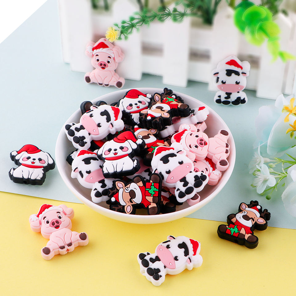 Christmas Pigs Cows Dogs Silicone Beads Pens Custom Infant Chew DIY Teething Silicone Charms Focal Beads for DIY Pens