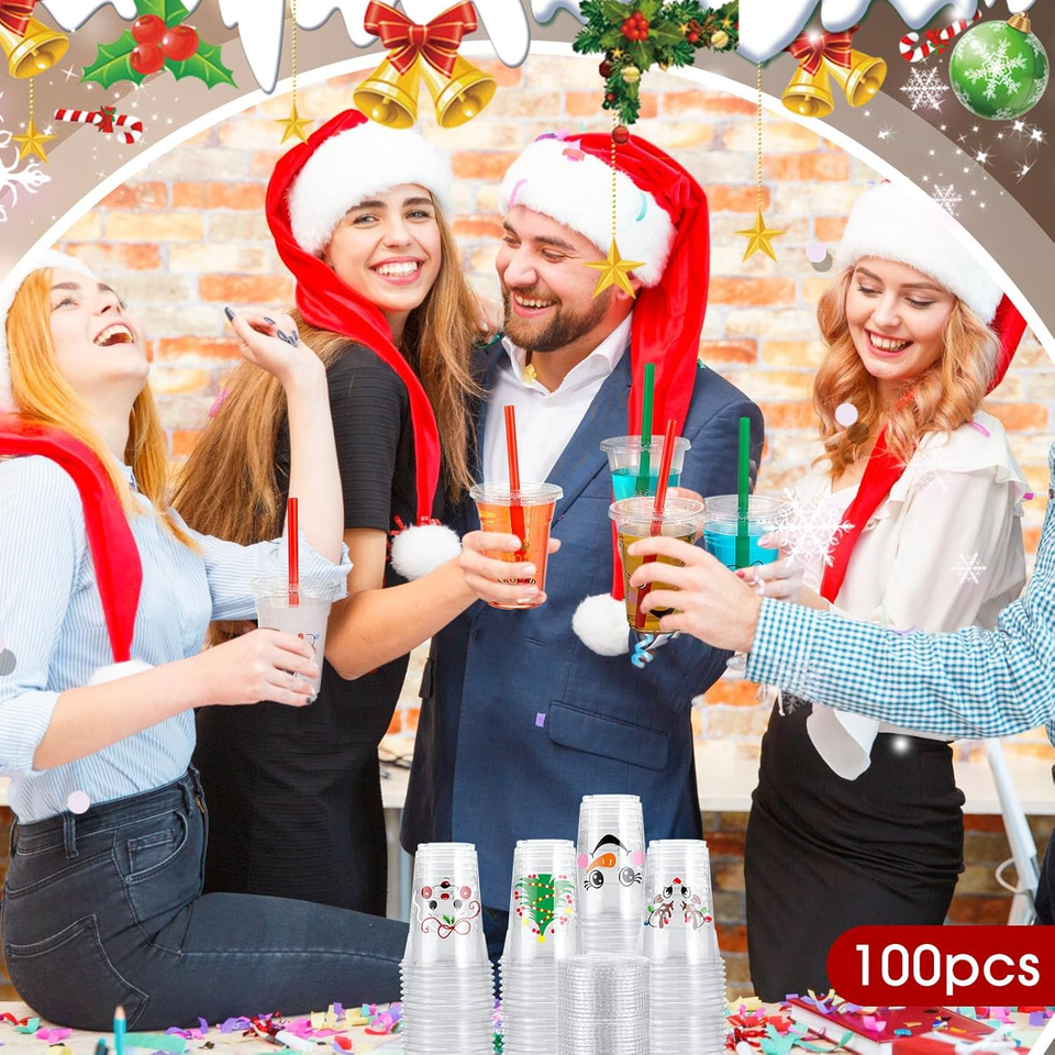 Christmas Recyclable Biodegradable Plastic Cups with Lids and Straws Leak Proof Disposable Holiday Party Supplies Durable Cups