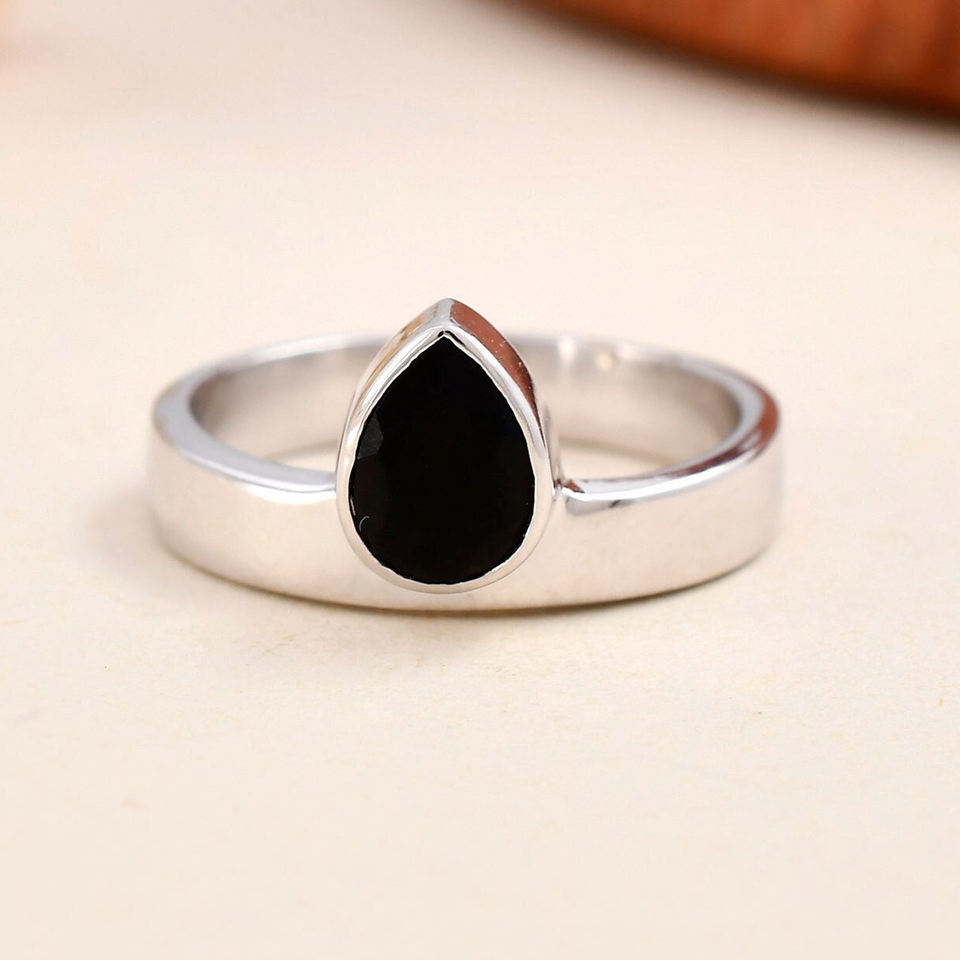 Christmas Sale Genuine 925 Sterling Silver Women's Band Ring Natural Black Onyx 7x9mm Pear Bezel Setting Christian Wholesale