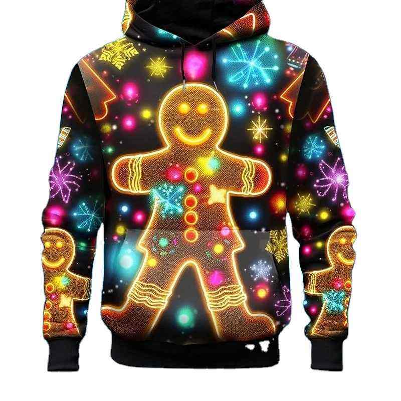 Christmas Theme Formal Knitted Men's Short Sleeve Pullover Hoodie Silk Screen Printed Gingerbread Tree Lights Funny Fashion