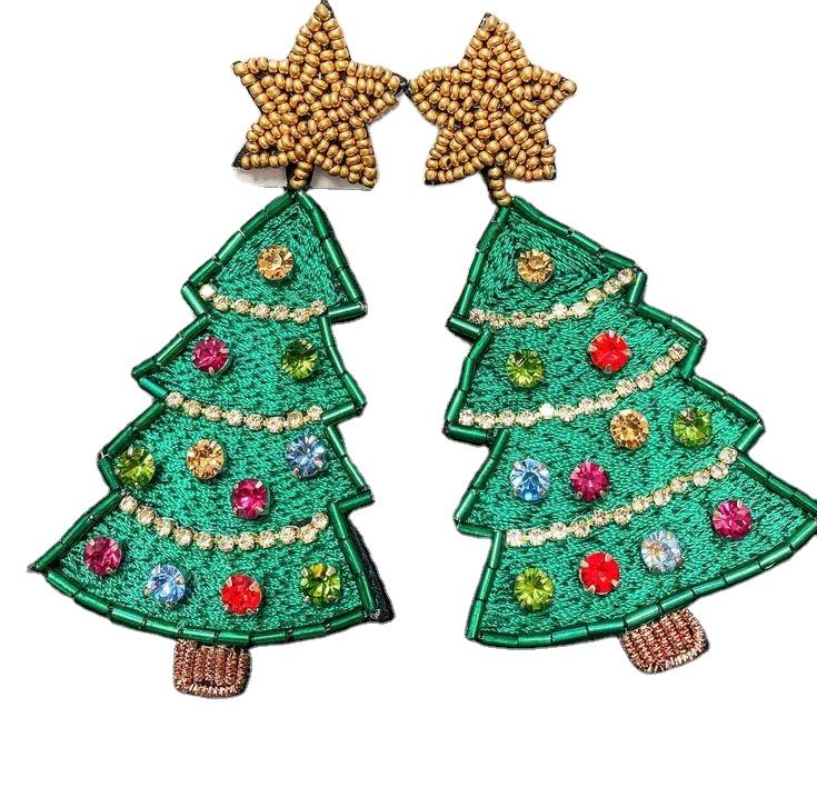 Christmas Tree Earrings Holiday Beaded Jewelry Seed Beads Embroidery Tree Earrings From India Handmade Earrings for Women