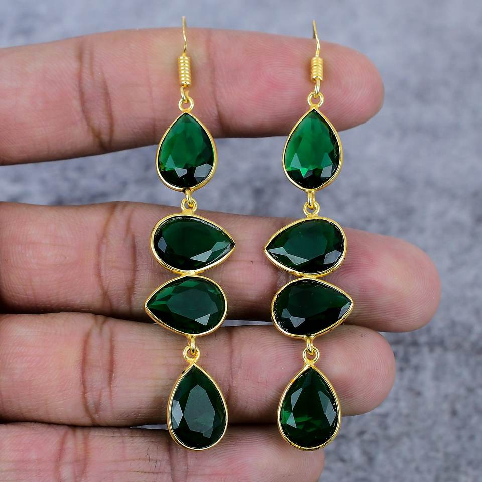 Chrome Diopside Four Gemstone Sterling Silver Gold Plated Pear Shape Dangle Drop Earrings for Wedding and Gift