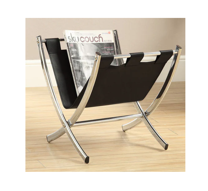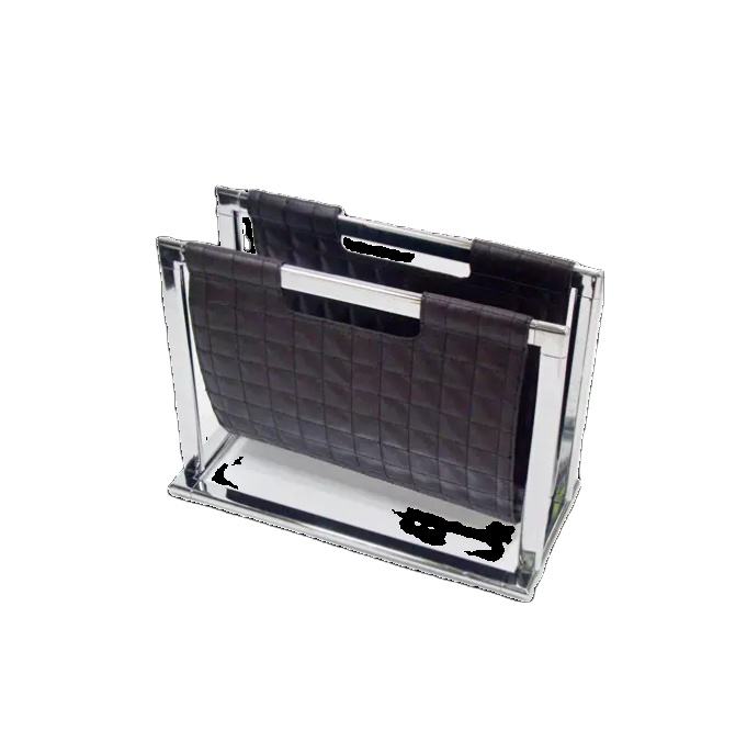 Chrome Plated Metal Frame & Black Leather Magazine Rack for Tableware and Floor Books & Magazines Holder for Office Desktop