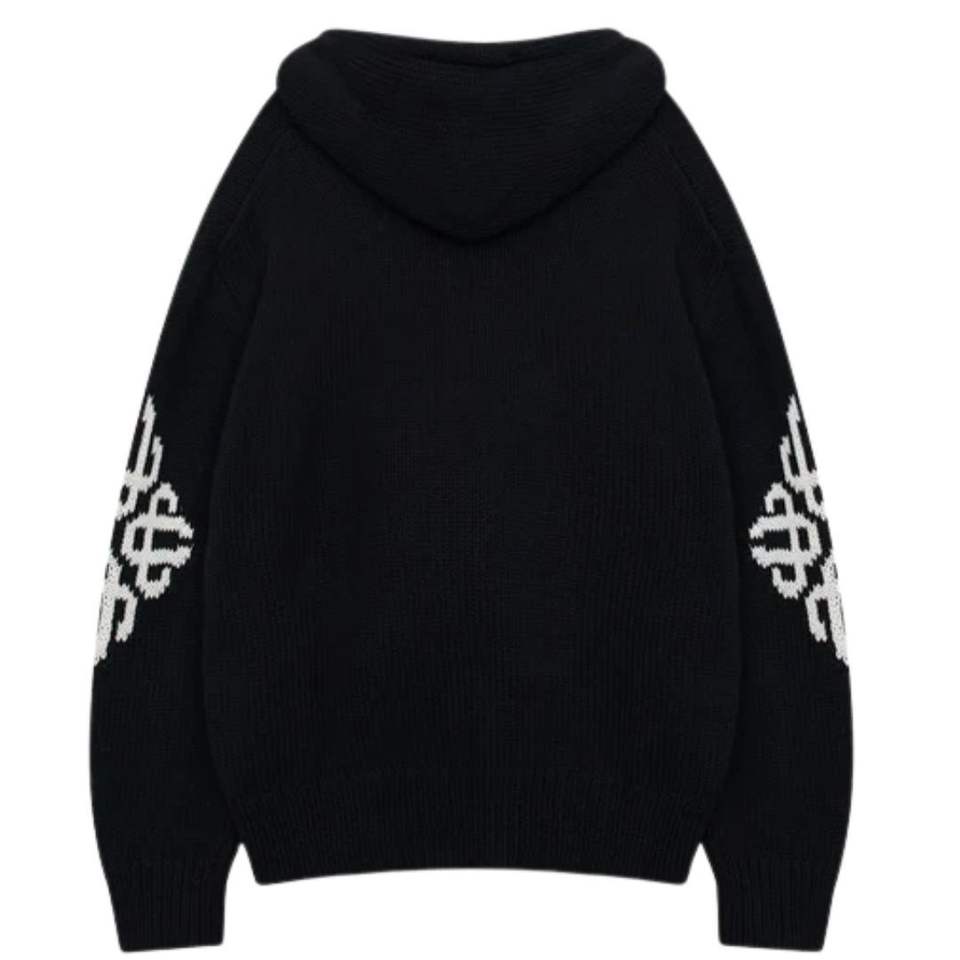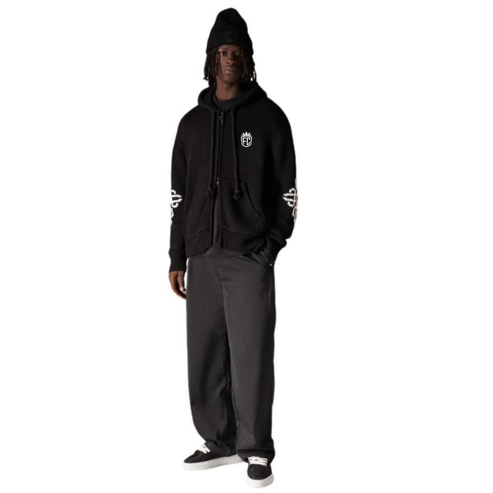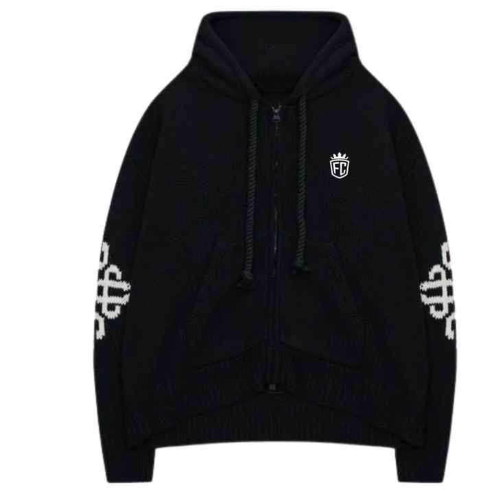 Chunky Knit Emblem Zip Through Hoodie Black With Embroidered Logo Soft Comfortable Knitwear Perfect for Casual Streetwear