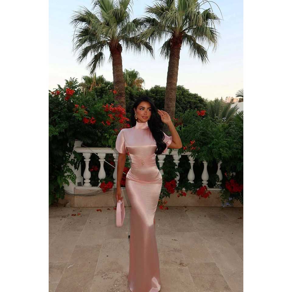 Chyna Powder Pink Evening Dress Chic Romantic Party Style with Sequins Beading Empire Waist Short Sleeves Plus Size Floor-Length