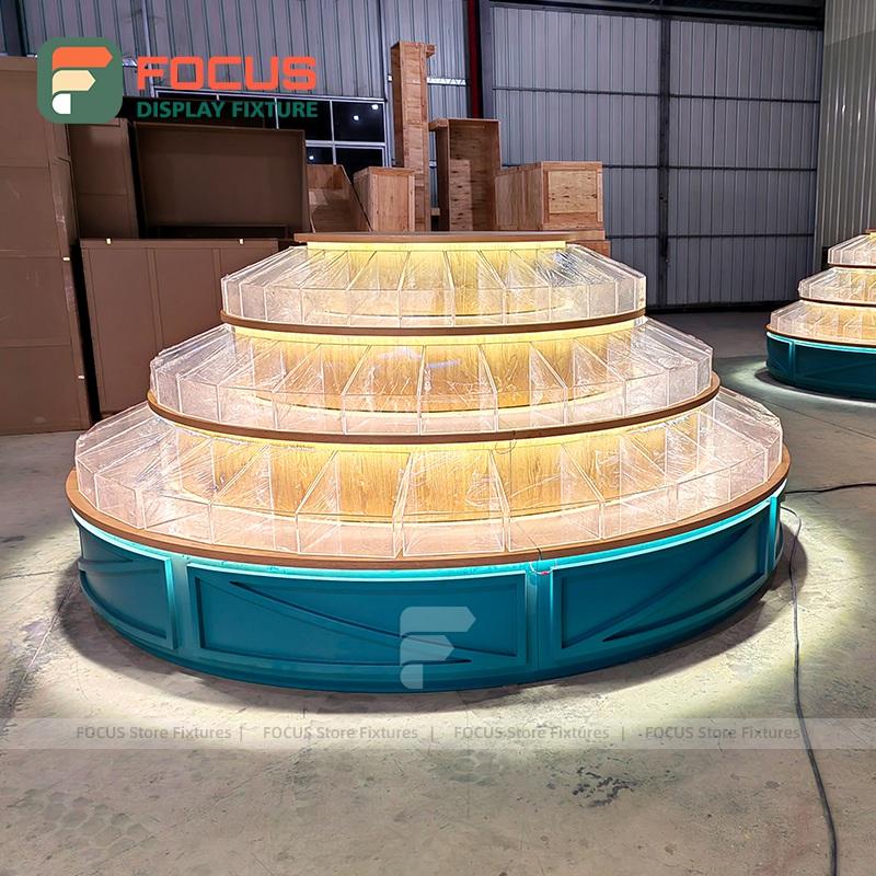 Circular Layered Retail Market Snack Center Display Acrylic Divided Bin Structure Custom Wooden Base Promotional Island Stand