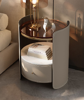 Circular luxury nightstand wrapped in beige leather with two shelves, marble base, and gold accents, at wholesale prices
