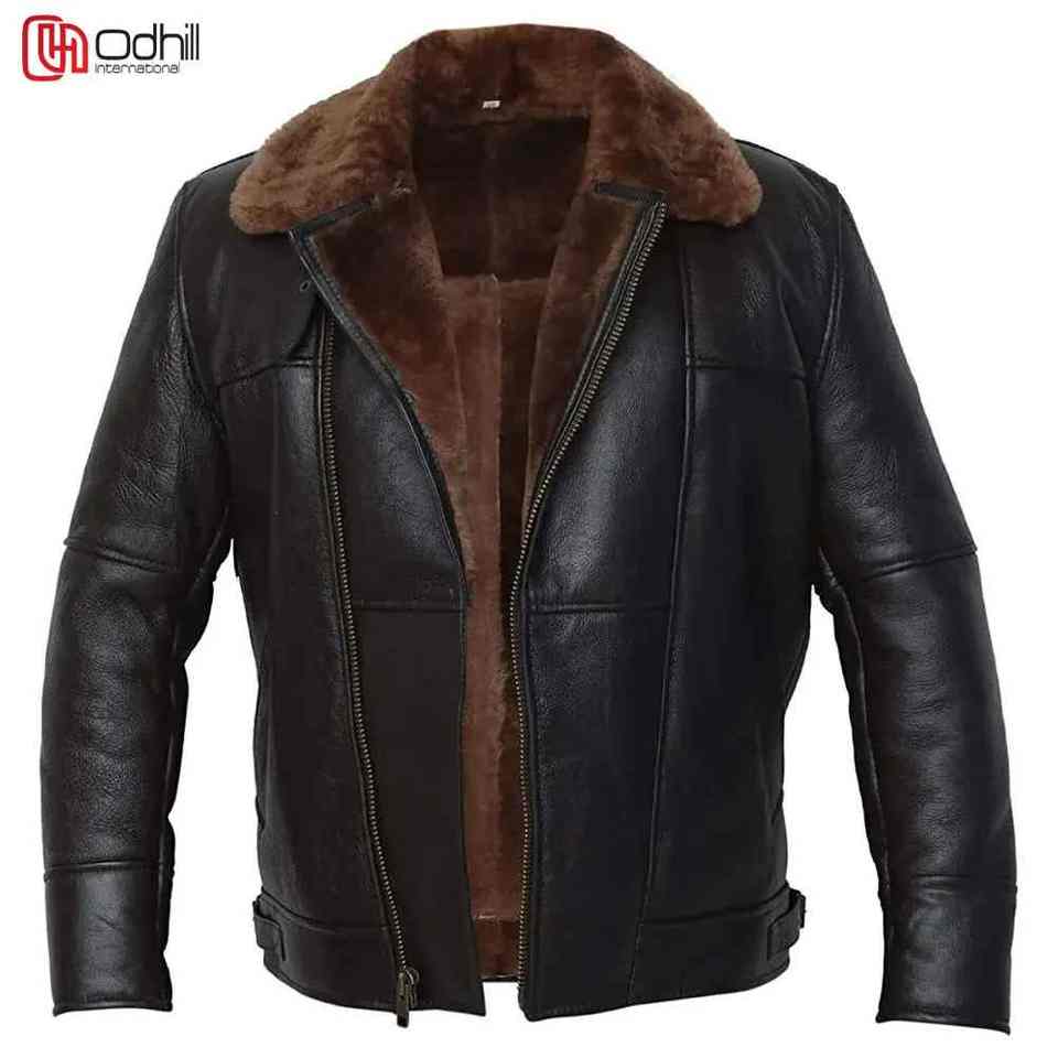Classic 100% Genuine Sheepskin Leather Brown Plus Size Bomber Jacket for Men Winter With Warm Shearling Fur Bomber Jacket