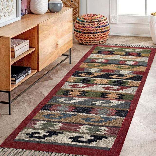 Classic 2x6 Feet Wool and Jute Dhurrie Carpet Runner Set for Minimal Yoga Spaces and Cozy Bedrooms