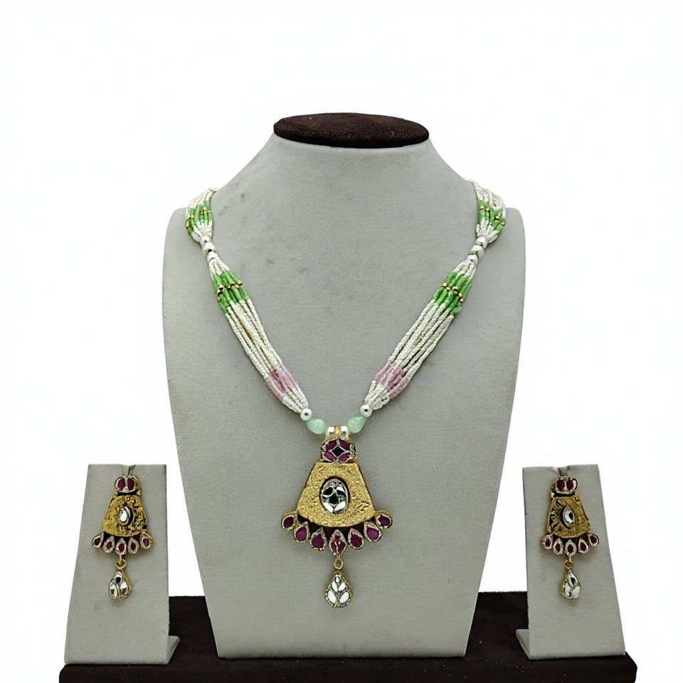 Classic 925 Silver Pearl Beaded Necklace Set with Green Pink Accents Traditional Pendant and Matching Earrings for Wedding Wear