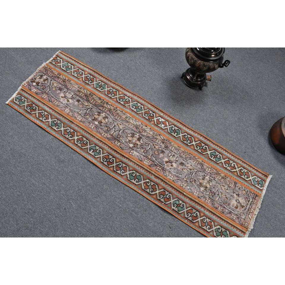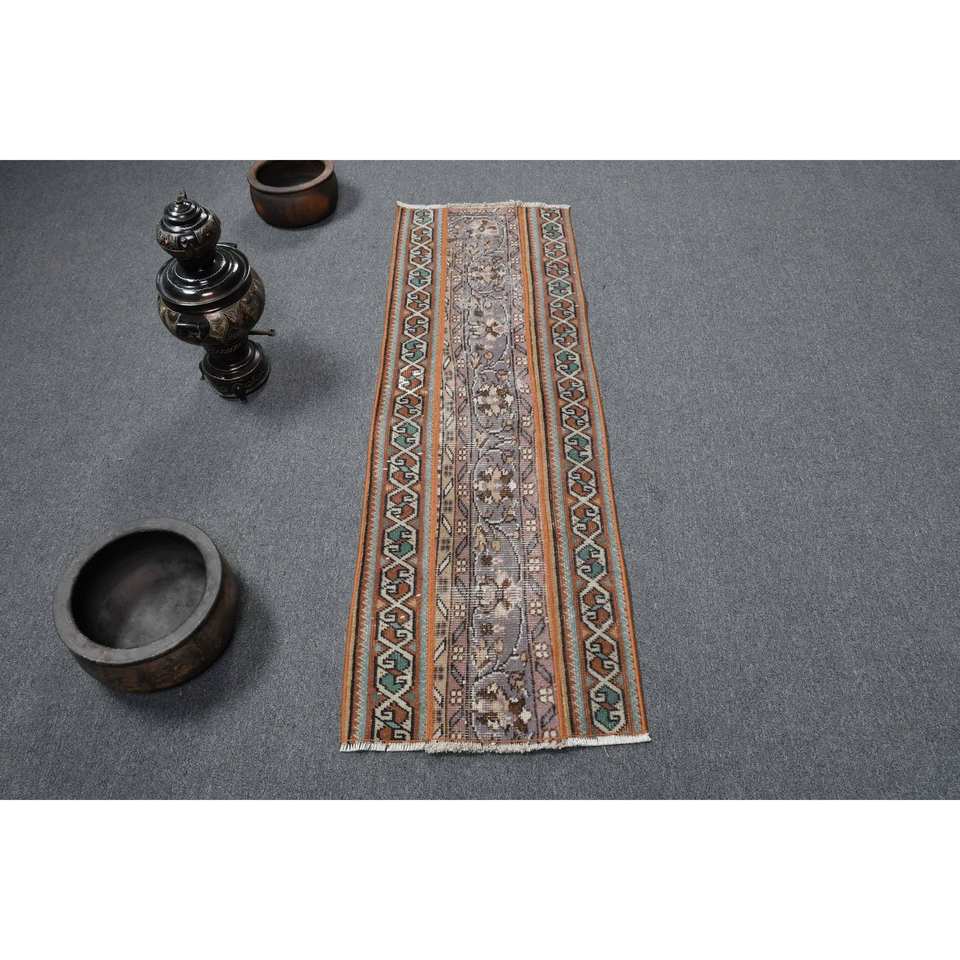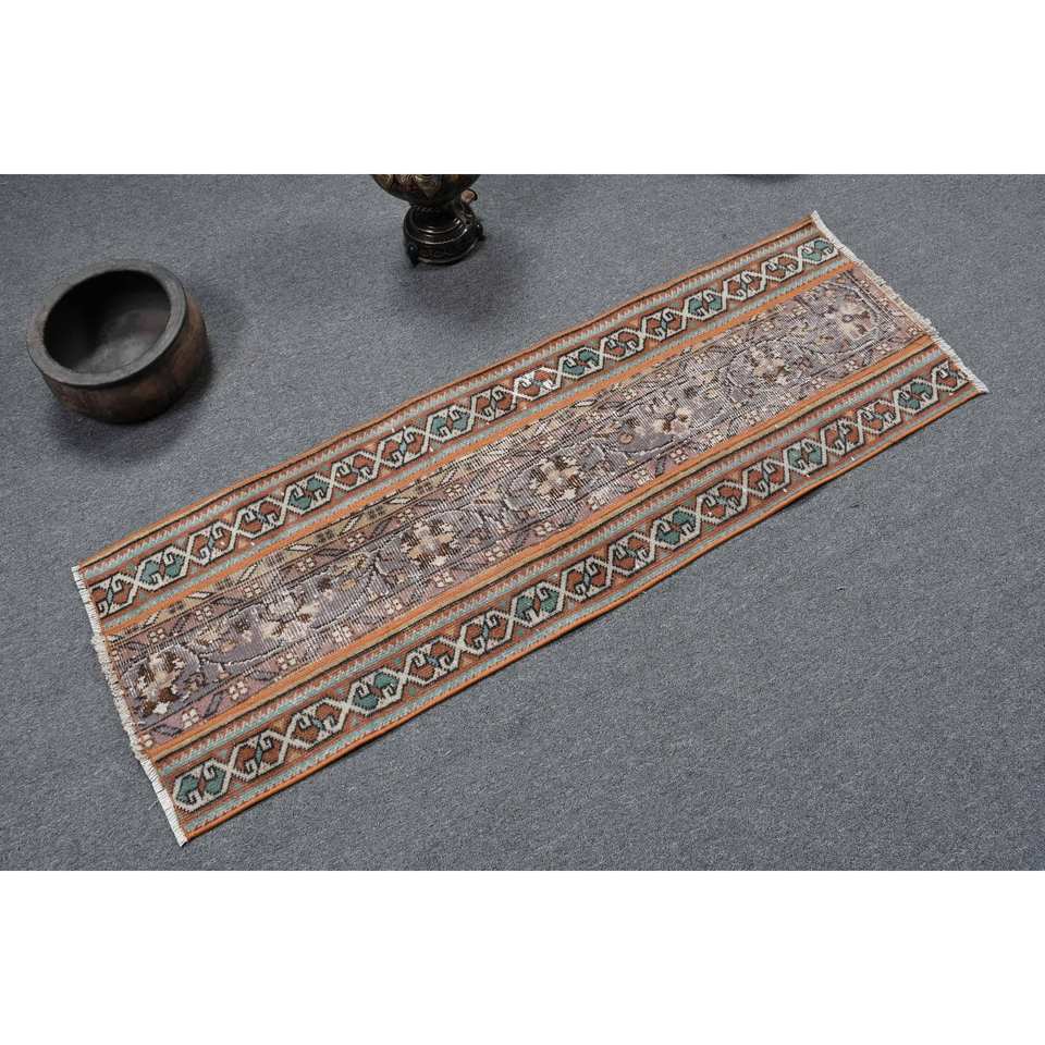 Classic Anatolian Brown Blue Wool Rug 1.6 X 5ft Vintage Turkish Handmade Patchwork Design Rectangle Hallway for Living Latex