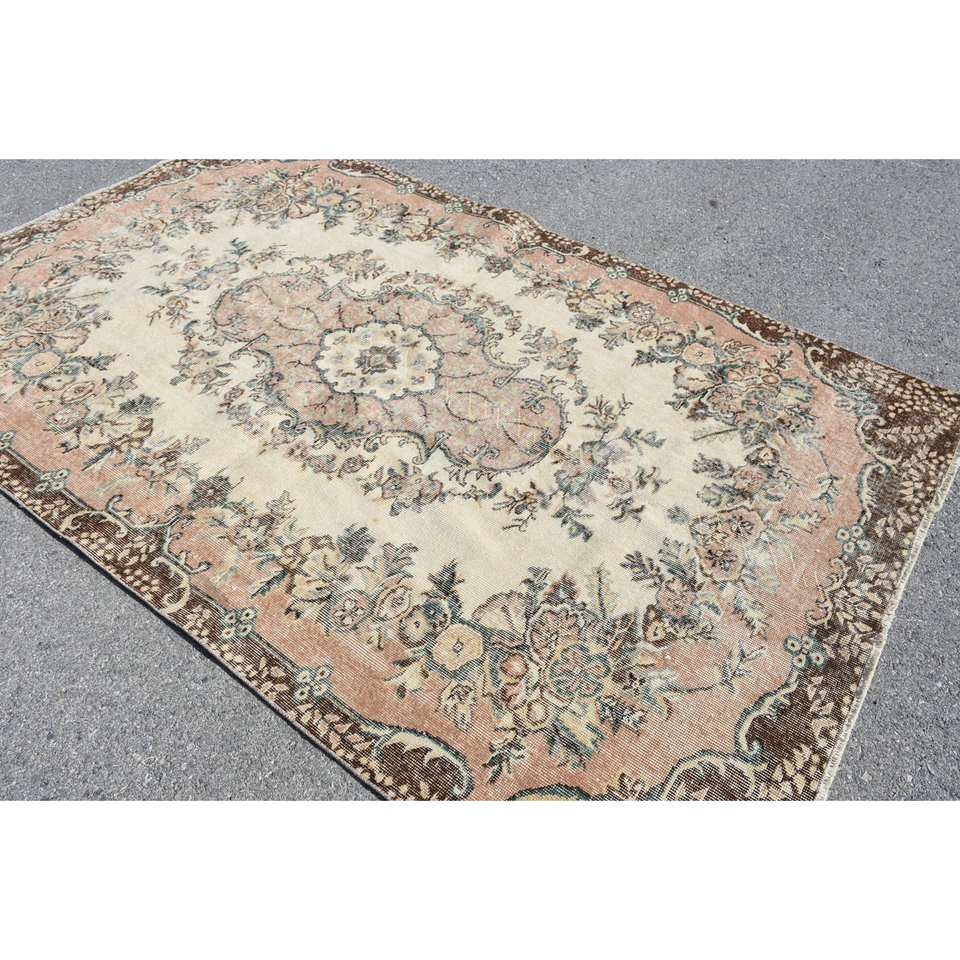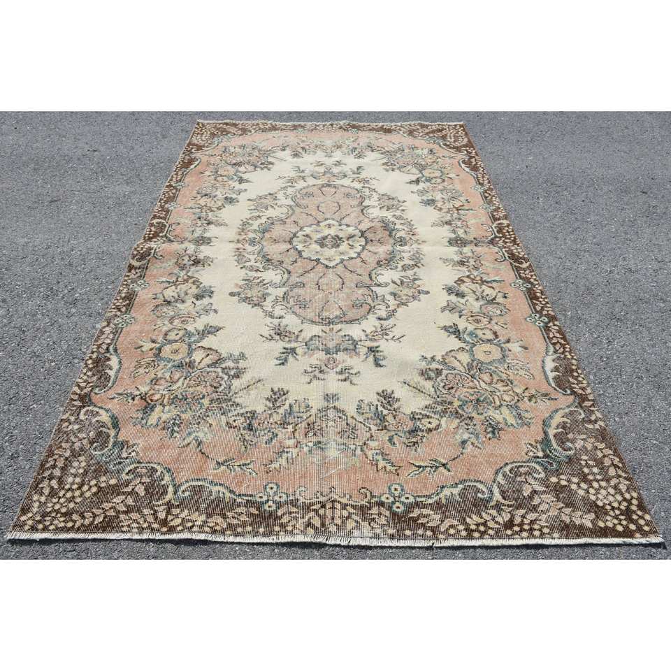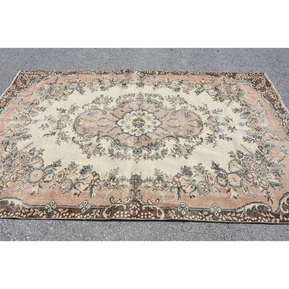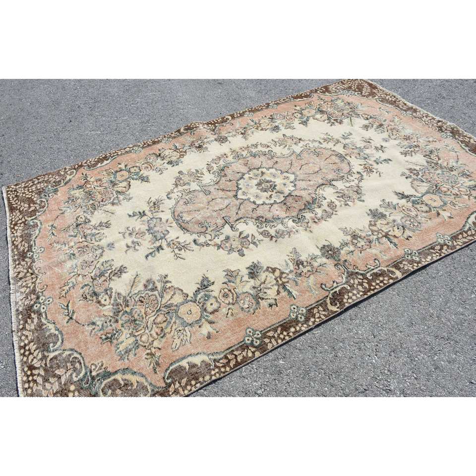 Classic Beige Brown Wool Rug 5.6 X 8.9 ft Handmade Turkish Rugs Rectangular Patchwork Design for Living Bedroom Hallway Latex