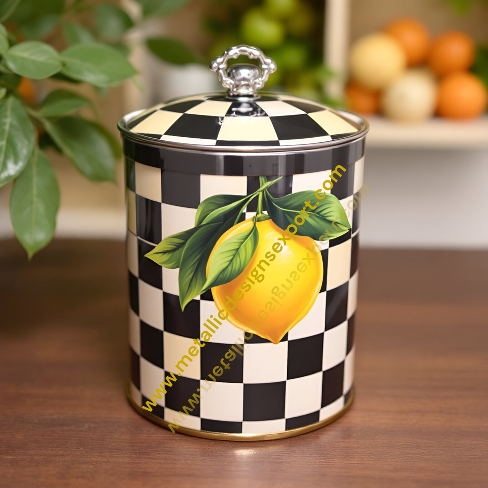 Classic Black & White Checkered Metal Kitchen Canister with Lemon Sticker Airtight Food Storage Jar Cover Styles for Condiments