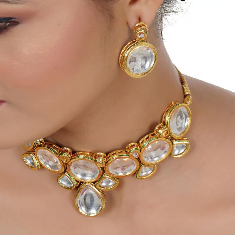 Classic Bollywood Latest Style Designer Kundan Choker Jewelry Set Necklace Earrings Gold Look Crystal Wedding Engagement