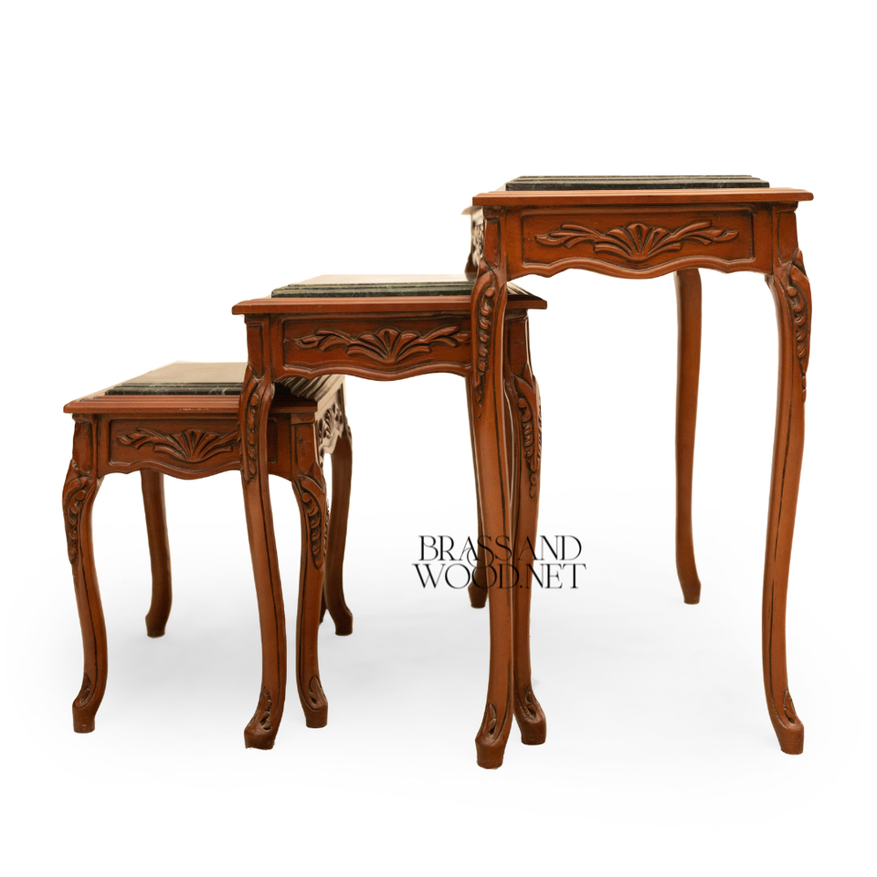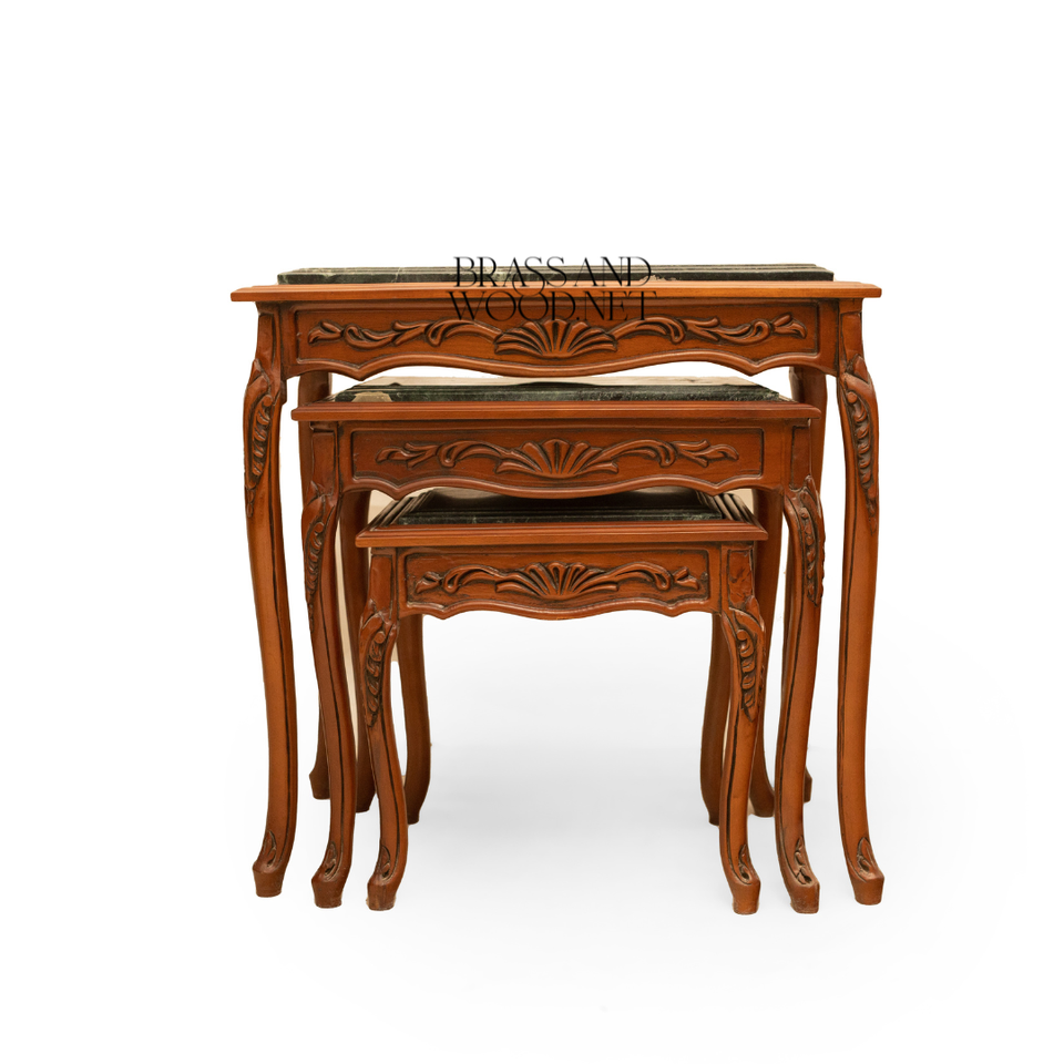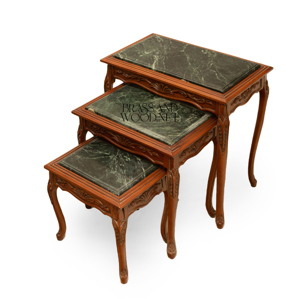 Classic Carved Wood Nesting Service Table Set with Elegant Green Marble Tops for Luxury Living Rooms and Premium Home Décor