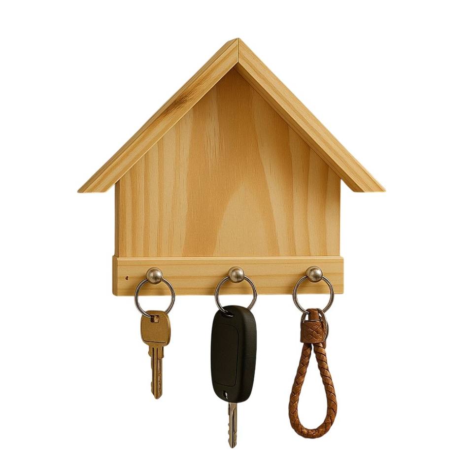 Classic Design House Shape Wooden Wall Key Holder With 3 Hooks Decorative Natural Pine Wood Key Rack For Entryway & Home Decor