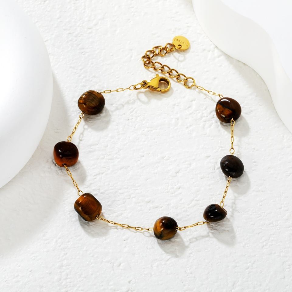Classic Gemstone Stainless Steel Bracelet Brown Natural Stone Beaded Wrist Jewelry Fashion Link Chain Bracelet for Women