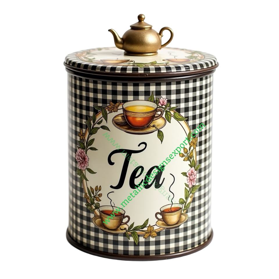 Classic Gingham Tea Canister with Floral Wreath & Teapot Lid Cream & Black Pattern Sticker Vintage Metal Storage Jar for Kitchen