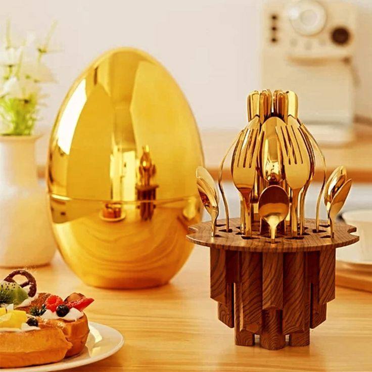 Classic Gold & Silver Cutlery Set of 2 With Egg Design Pot for Hotel Restaurant Dinnerware Set Spoon Knife & Fork Dinnerware Set