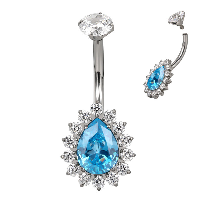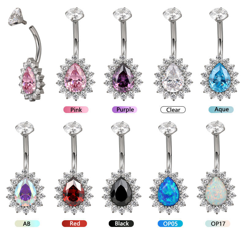 Classic High Quality ASTM F-136 Titanium Internally Threaded Bezel Set CZ Top Pear CZ Center Flower Belly Ring Body Zircon