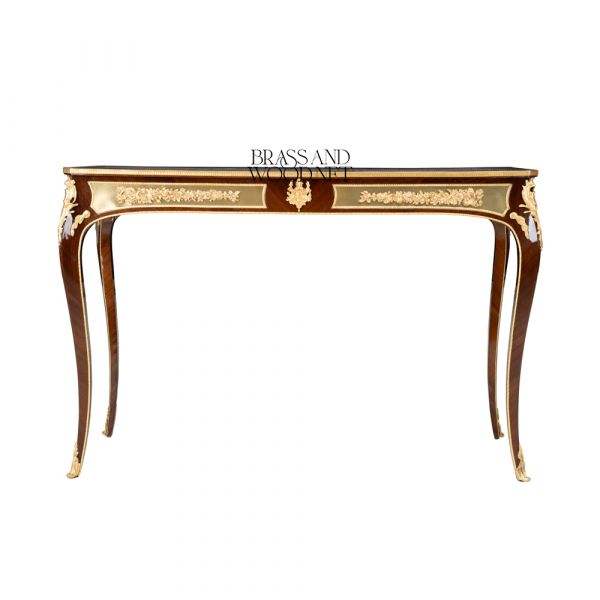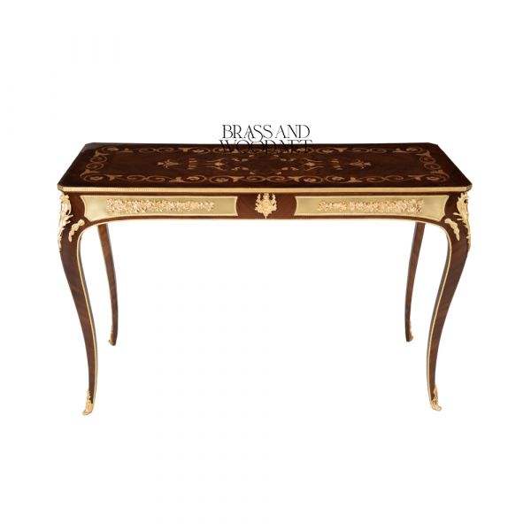 Classic Inlaid Wooden Console Table with Long Silhouette Curved Legs and Ornate Brass Details Elegant Luxury Console