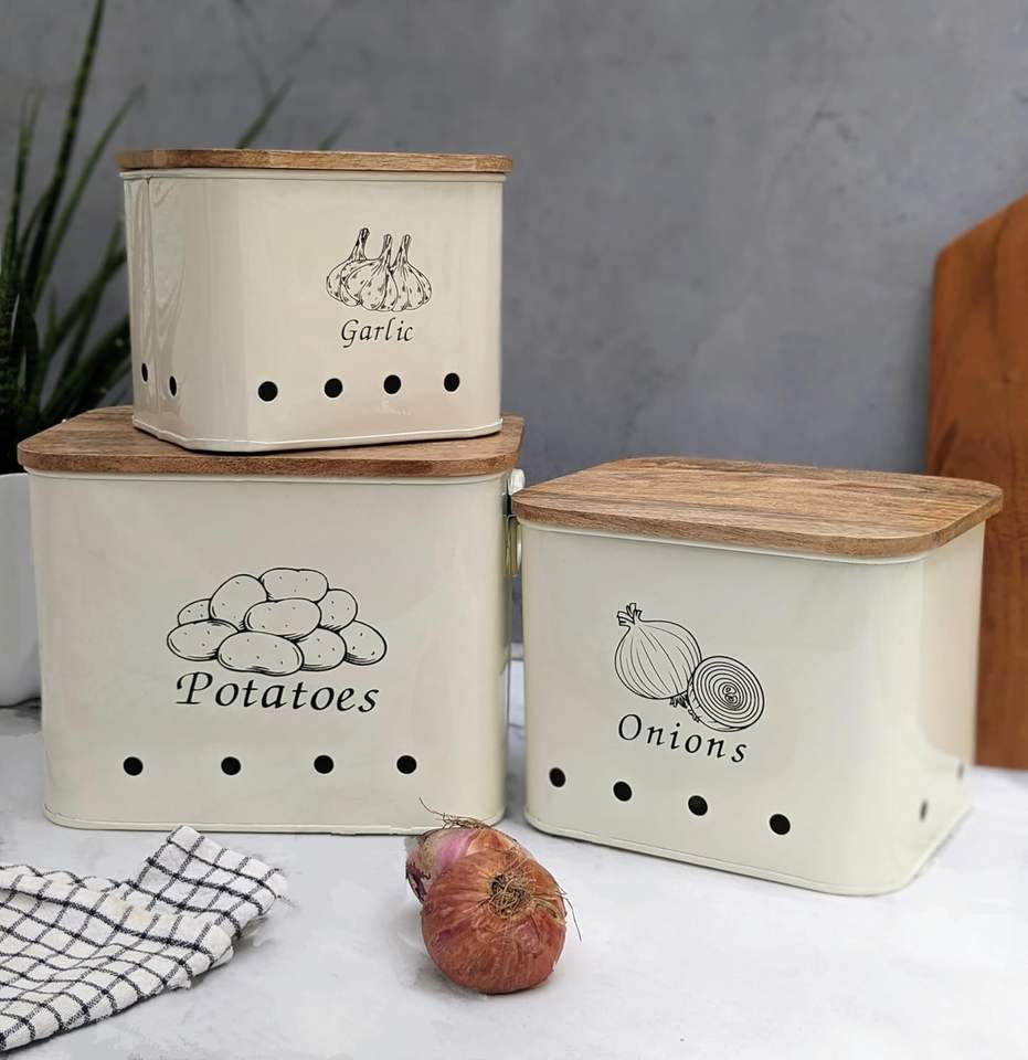 Classic Kitchen Storage Containers Set of 3 Metal Jars With Lid Potato, Onion & Garlic Food Safe