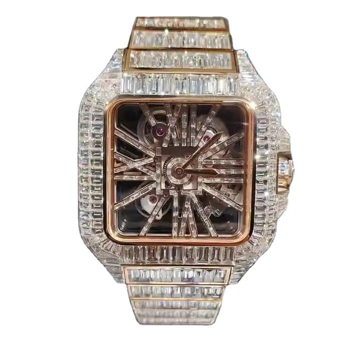 Classic Luxury Fashion Hip Hop Digital Diver Watch Stainless Steel Band Fully Baguette Cut Moissanite Diamond Skeleton Water