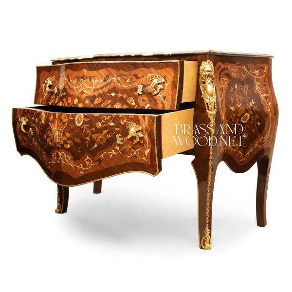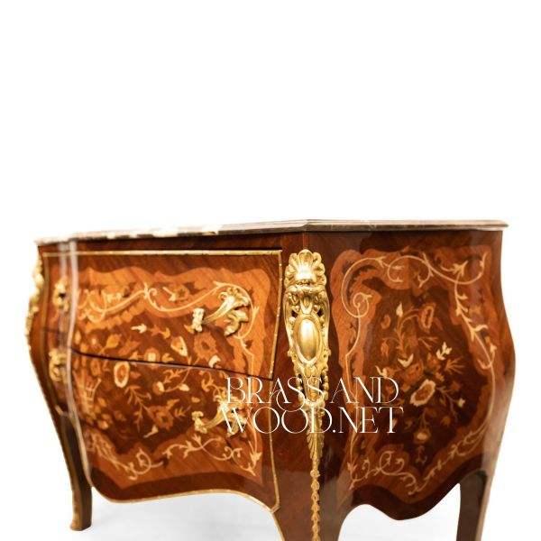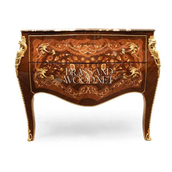 Classic Marquetry Wooden Chest with Marble Top Curved Front Luxury Handcrafted Console Traditional Elegant Furniture
