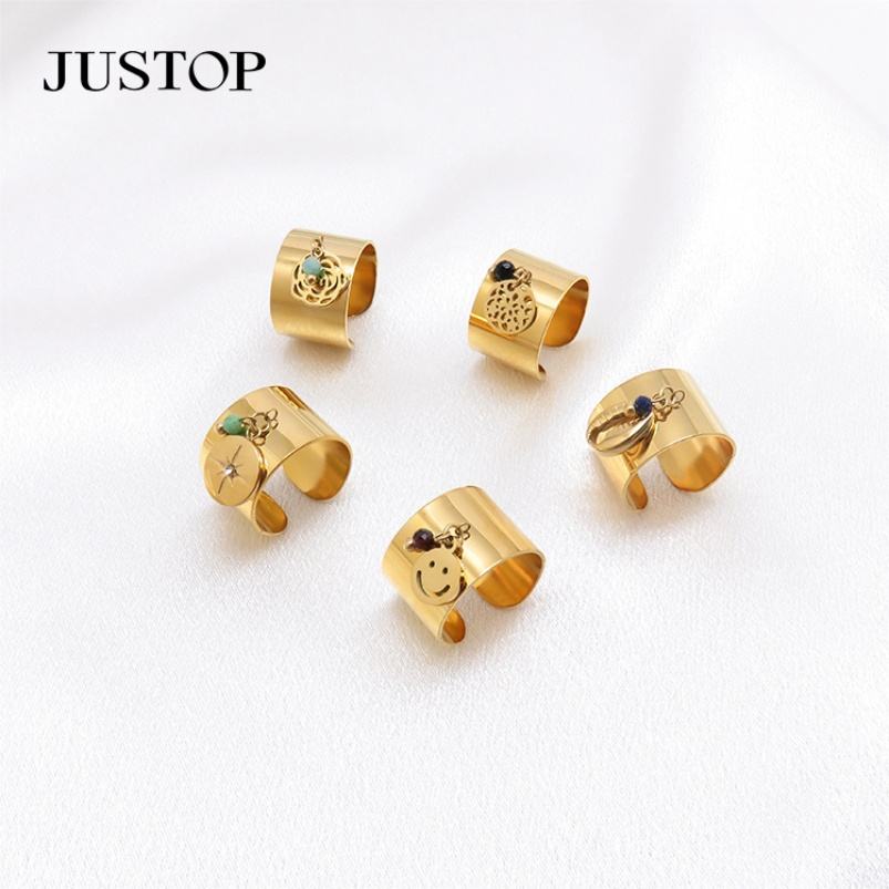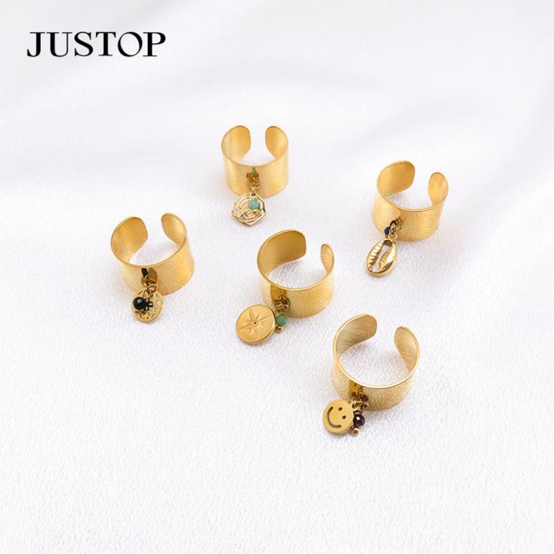 Classic Minimalist 18k Gold Plated Stainless Steel Agate Charm Pendant Wide Adjustable Opening Finger Charms Rings for Women