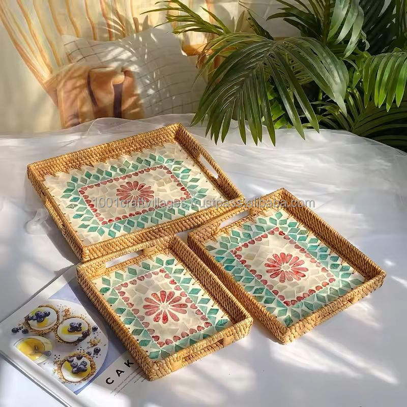 Classic Mother of Pearl Inlaid Rattan Tray for Home Decor and Table Service Available from Reliable Supplier Sustainable Vietnam