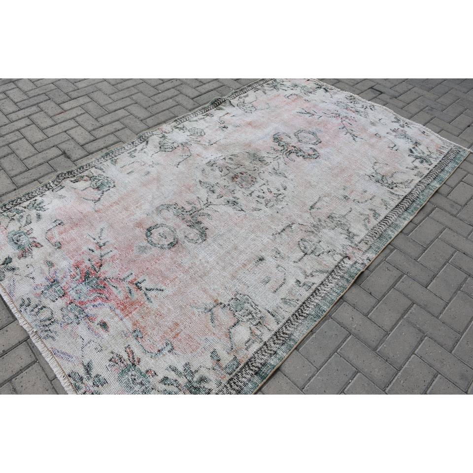 Classic Pink Green Patchwork Wool Rug 5.8 X 7.8 ft Handmade Turkish Tabriz Style for Living Room Rectangle Striped Pattern Latex