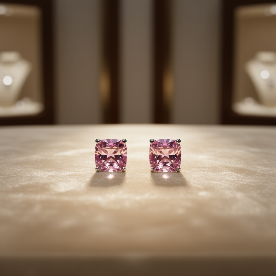 Classic Pink Princess Cut Stud Earrings For Women, Geometric Design With Claw Setting, Copper Material, Fine Jewelry E607