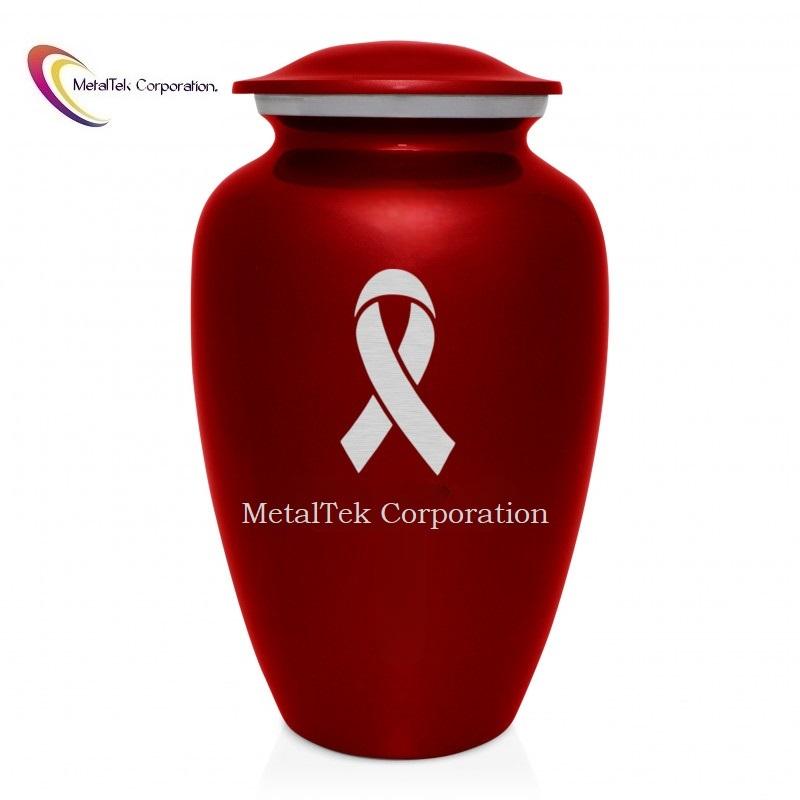 Classic Red Alloy Metal Adult Cremation Urns Cancer Ribbon Print Memorial Ashes Storage Burial Jars Wholesale Funeral Supplies