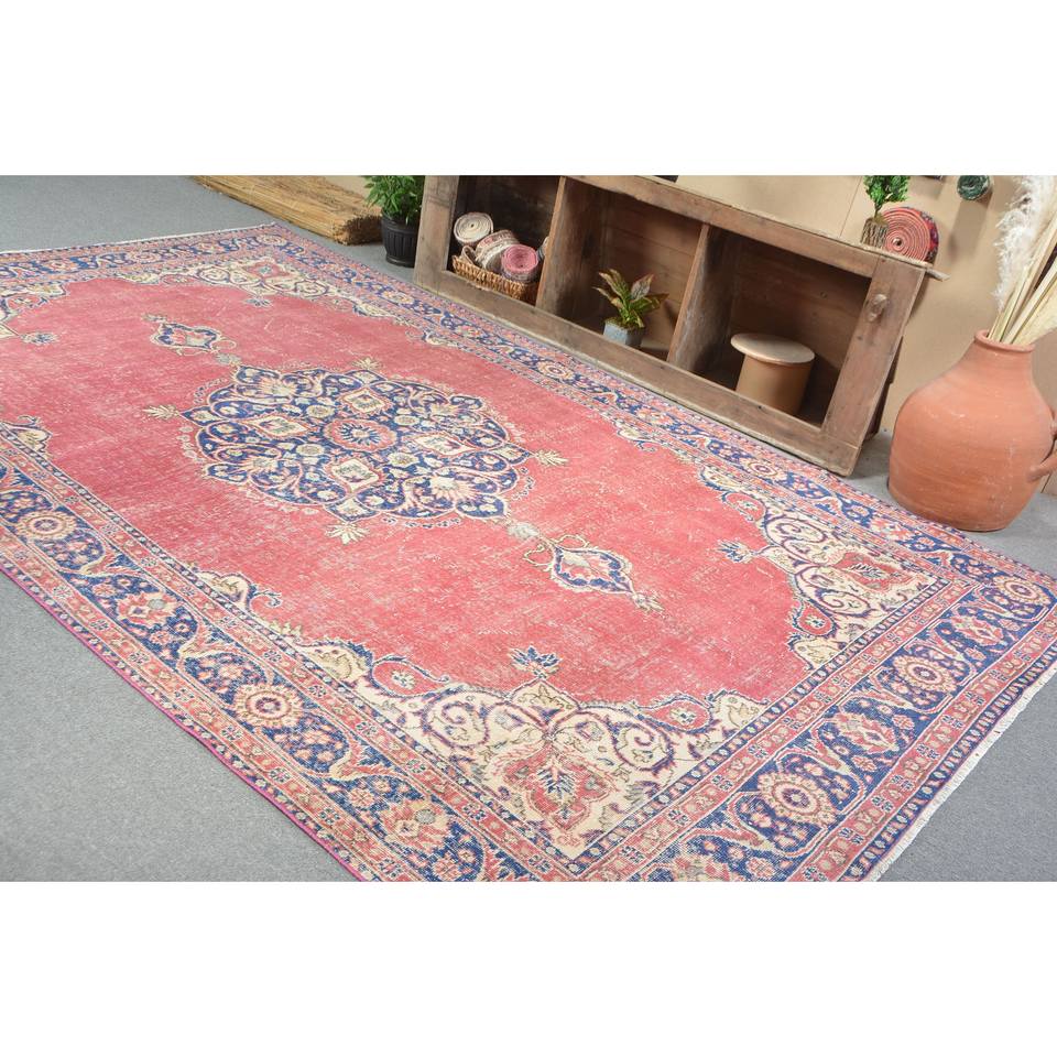 Classic Red Blue Vintage Turkish Rug 6.7 X 11 ft Large Area Rectangle Patchwork Design Organic Cotton Wool Latex Hallway Room