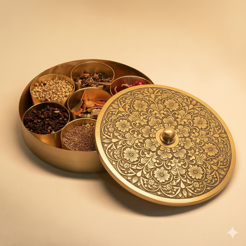 Classic Round Brass Spice Organizer with Lid and Spoon | Traditional Masala Storage Box for Food Preparation and Hotel Supply