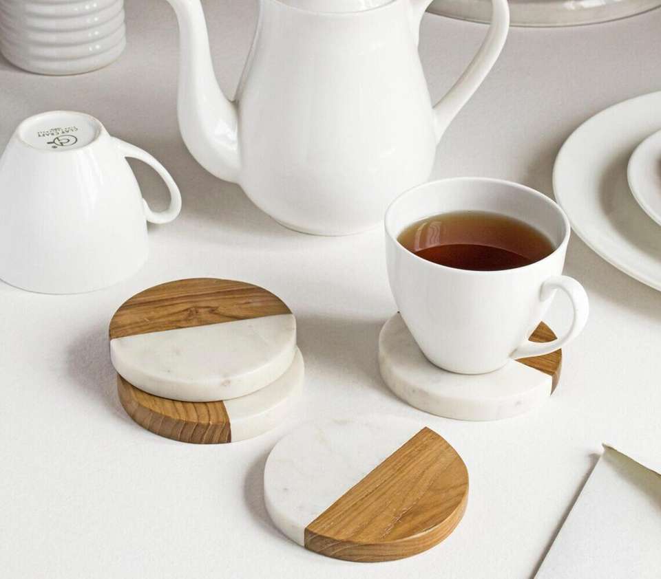Classic Set of 4 Marble & Wood Colorblock Round Coasters 5mm Thick Stone Coasters