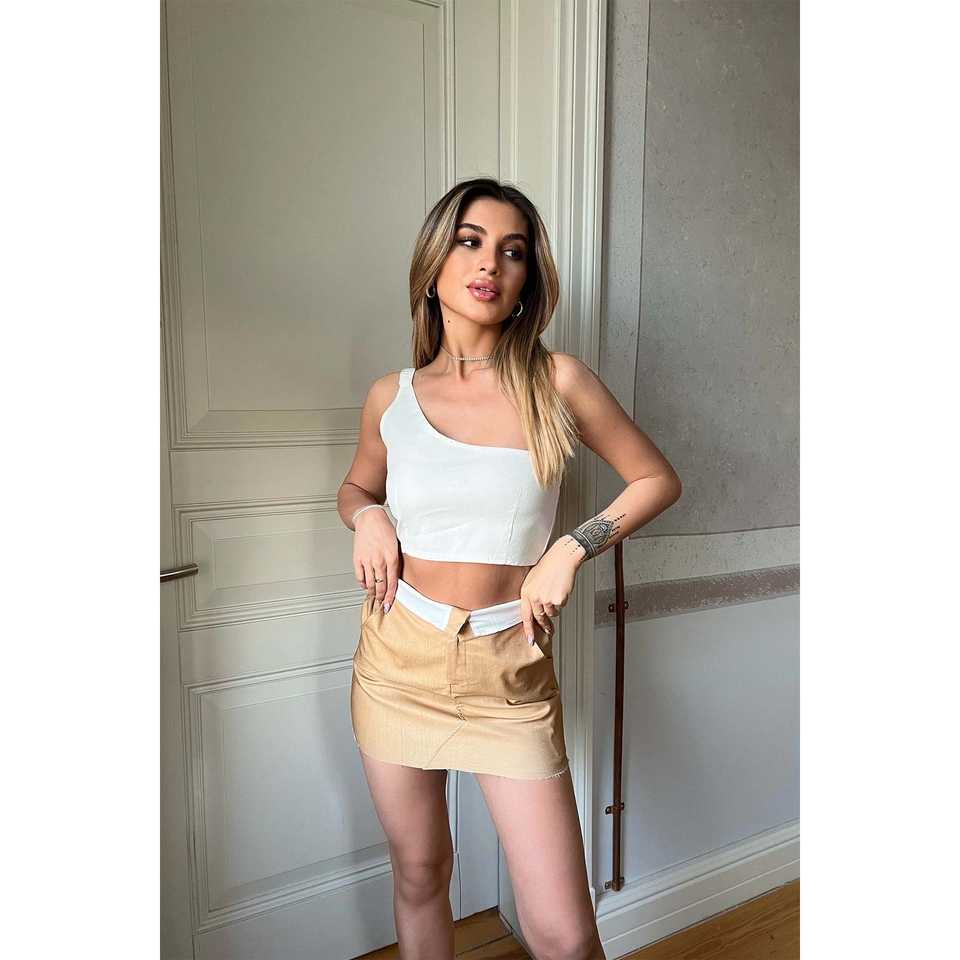 Classic Tan Floral Print Mini Skirt Summer Casual Straight Style Genuine Leather Spandex XS Size Empire Waistline Club Apparels
