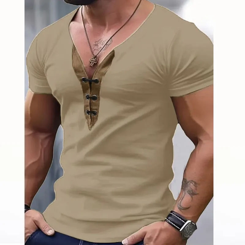 Classic Top Mens Vintage V Neck Drawstring Patchwork T Shirt Casual Short Sleeve Slim Fit Men T-Shirts Summer Leisure Pullovers
