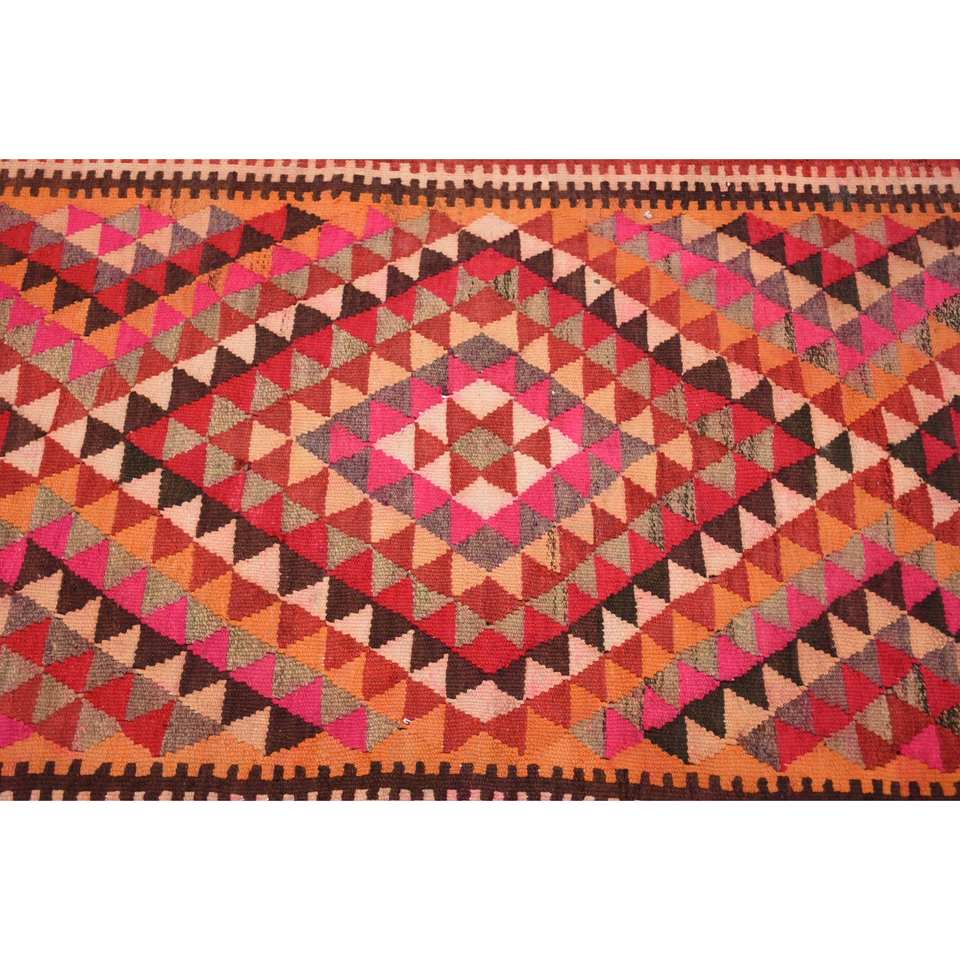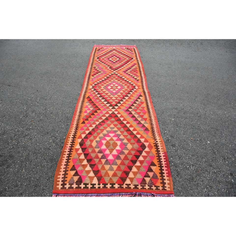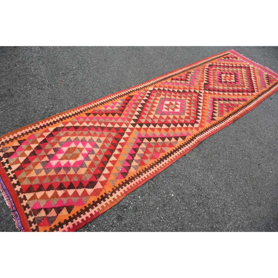 Classic Turkish Kilim Rug 3 X 10.2ft Pink Orange Patchwork Design Wool Viscose Flat Weave Latex Jacquard Rectangle Hallway