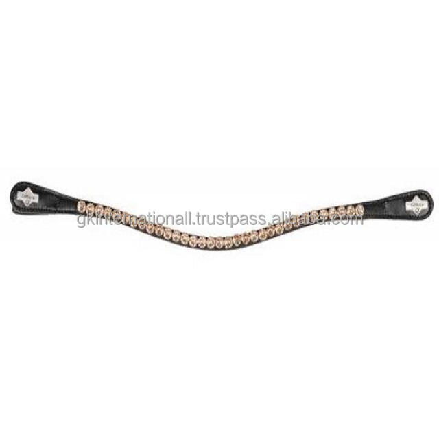 Classic Wave Shape High Quality Black Leather Horse Brow Band Diamante Brow Band with 1 Row of Multicolor Crystals Snap Loops