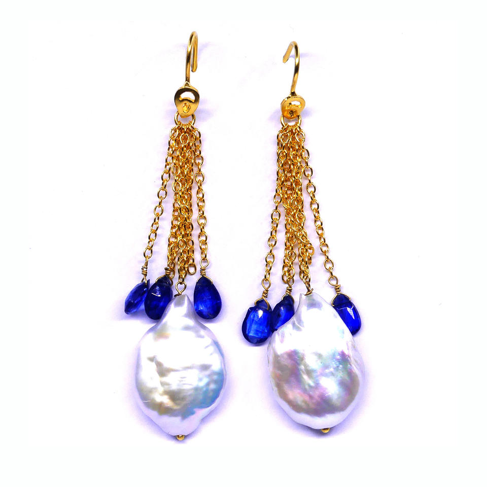 Classic Wedding Women's Chain Earring Set 925 Sterling Silver with Kyanite Baroque Pearl Gemstones Gold Plated