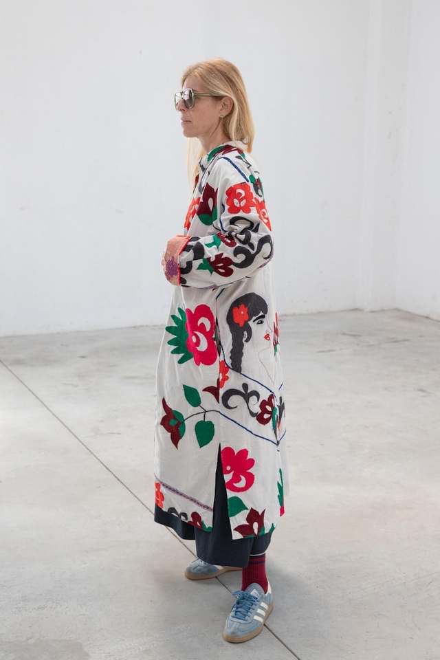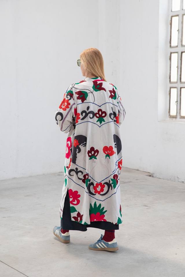 Classic Women's Suzani Hand Embroidered Floral Pattern Canvas Quilted Jacket Autumn Winter Boho Crewel Woven Button 100% Cotton