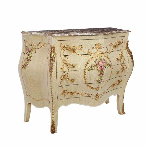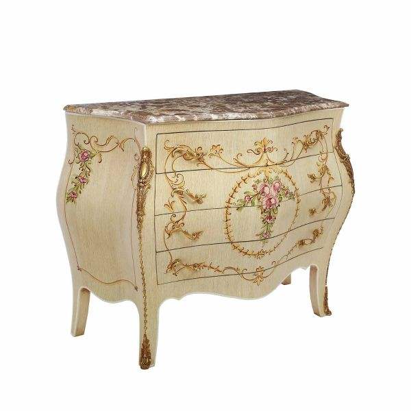 Classic Wooden Chest of Drawers with Hand Painted Floral Motifs Marble Top Curved Luxury European Design