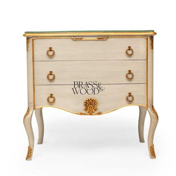 Classic Wooden Chest of Drawers with Soft Cream Finish Gilded Brass Ring Handles Curved Elegant Luxury Design