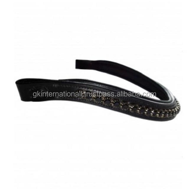Classic Anatomic Wave Shape Black Dressage Horse Brow Band Padded with Neoprene & Inlay Black Shiny Crystals Bling Brow Band