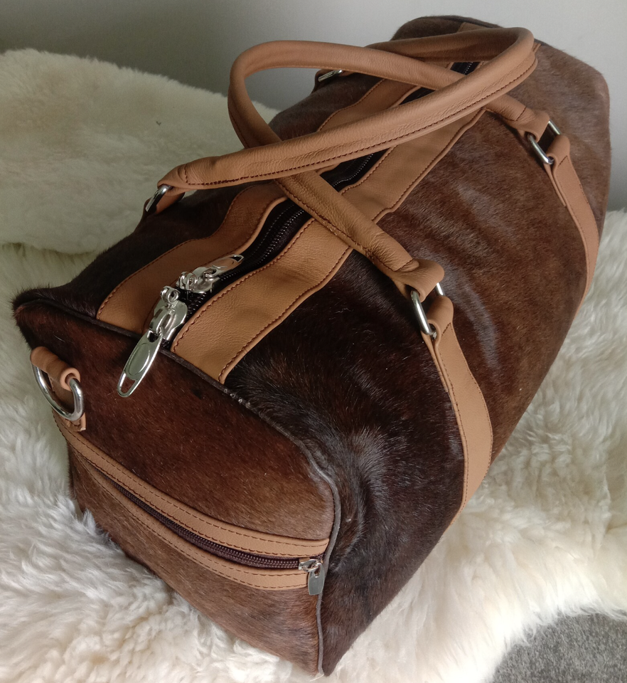Classic Brown Travel Golf Sport Duffel Cowhide Bag Luxurious Hairs on Cowhide Leather Duffel Bag for Men & Women